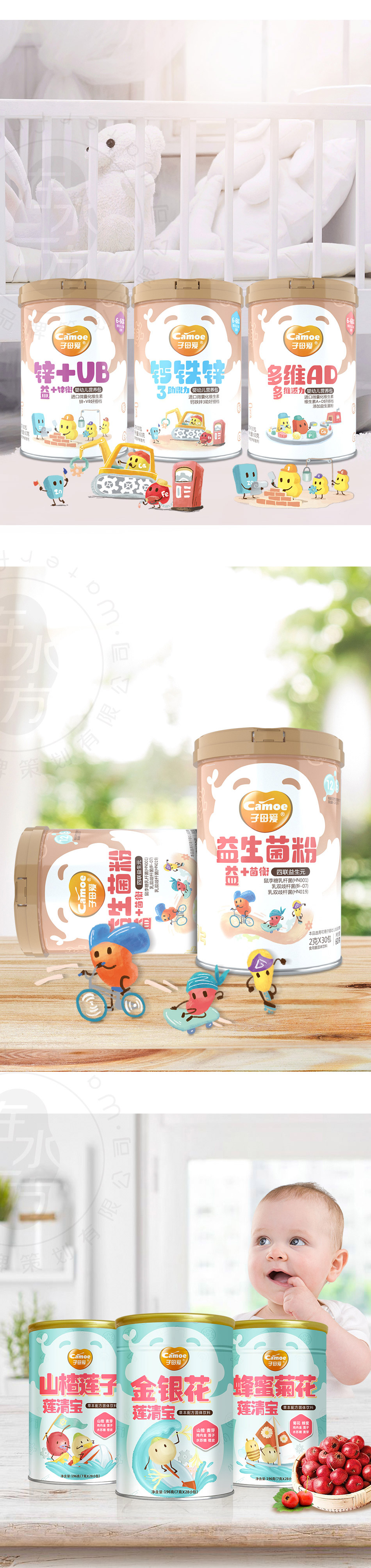 項(xiàng)目方案:子母愛(ài)品牌圍繞嬰童輔食營(yíng)養(yǎng)品領(lǐng)域打造有情感有品質(zhì)有親和力的品牌形象,迎合當(dāng)前年輕消費(fèi)市場(chǎng)的審美和體驗(yàn)需求,用原創(chuàng)性手繪風(fēng)格增加產(chǎn)品訴求力,提升陳列效果的同時(shí)也有助于品牌口碑和營(yíng)銷的推進(jìn)。