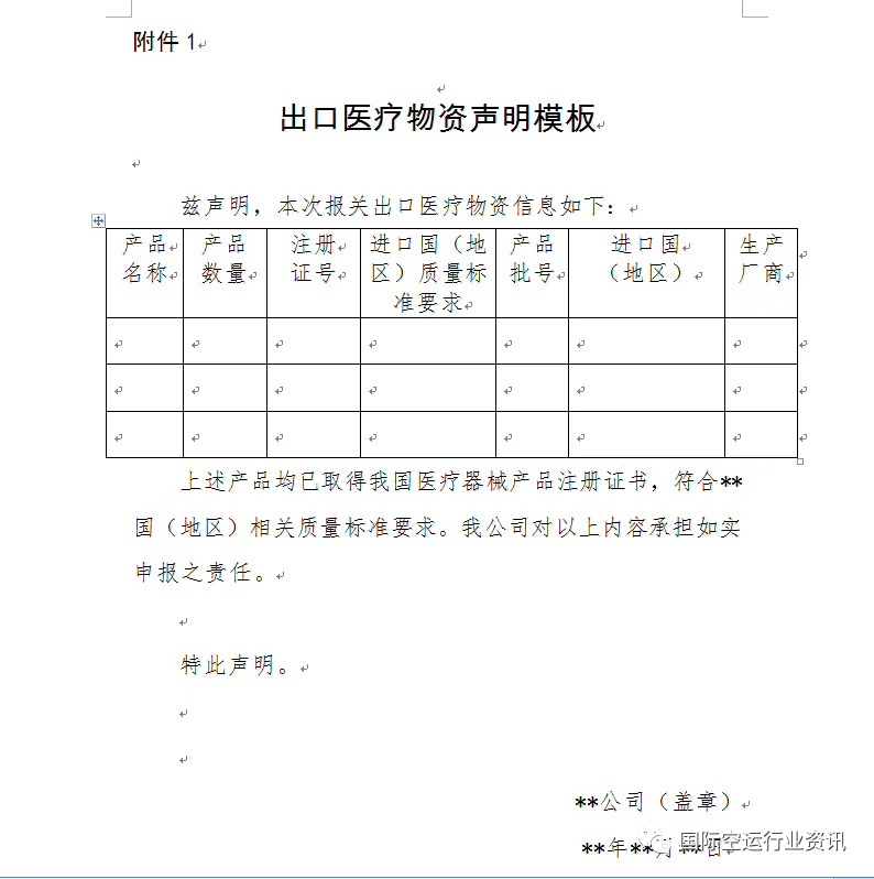 (出口醫(yī)療物資聲明:表格不能留空,表頭不要有模板兩個(gè)字,蓋生產(chǎn)銷(xiāo)售單位公章,每項(xiàng)必須填滿(mǎn))