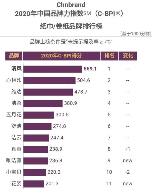 日前,品牌評級與品牌顧問機(jī)構(gòu)Chnbrand發(fā)布2020年中國品牌力指數(shù)排行榜,APP(中國)旗下品牌清風(fēng)憑借569.1的C-BPI得分,榮獲2020年C-BPI中國品牌榜紙巾/卷紙類第一品牌*,這已是清風(fēng)第2年榮登榜首。
