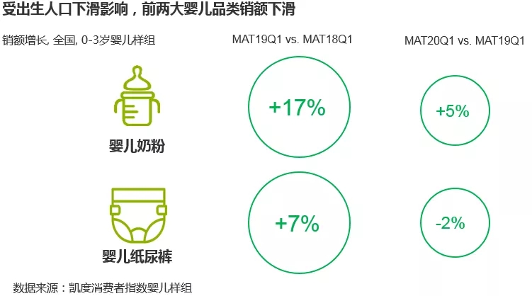 受到新生人口減少的影響,母嬰市場(chǎng)兩大頭部品類——奶粉和紙尿褲增長(zhǎng)開始放緩。凱度消費(fèi)者指數(shù)顯示,2019年一季度嬰兒紙尿褲銷售額同比增長(zhǎng)7%,但2020年一季度同比下滑了2%,這一部分下跌與年初的疫情事實(shí)上關(guān)系不大。多位資深從業(yè)者表示,即便身處動(dòng)蕩的疫情環(huán)境下,消費(fèi)者對(duì)于奶粉、紙尿褲這樣的剛需產(chǎn)品的投入絲毫不會(huì)吝嗇。