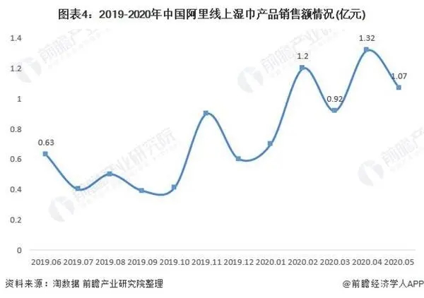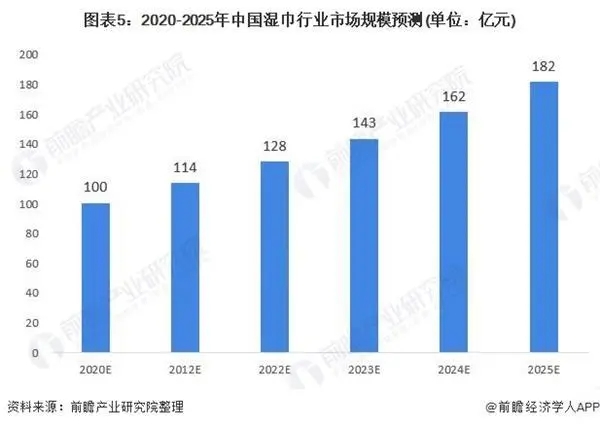另一方面,2019年底全國疫情的爆發(fā)極大地刺激了濕巾的消費需求。2020年1-5月,阿里濕巾線上銷售額均在1億元左右,2020年4月銷售額更是高達1.32億元,2020年2月環(huán)比增速達到113.63%。此次“新冠疫情”較2003年非典更加嚴重,進一步激化了國人對衛(wèi)生健康的關注。同時,隨著我國經(jīng)濟積極向好,居民消費能力及意愿不斷提升,企業(yè)不斷探索制造多元化的濕巾,后疫情時代我國濕巾行業(yè)發(fā)展前景更為明朗,預計2025年市場規(guī)模有望達到182億元。