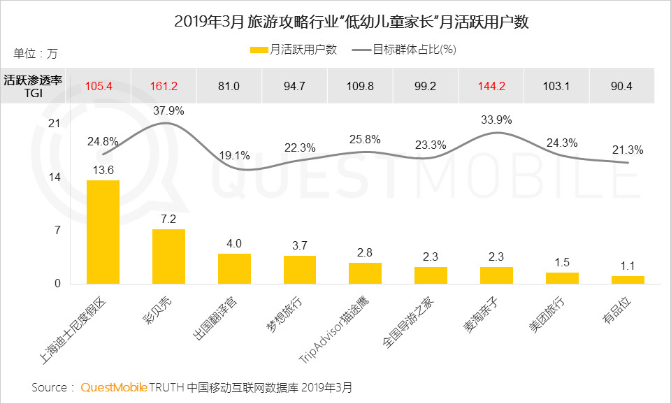 在親子旅游方面,隨著親子節(jié)目的熱播,讓近兩年親子游市場持續(xù)火爆。在旅游攻略APP中,彩貝殼目標群體占比37.9%,其次為麥淘親子33.9%,而麥淘親子、上海迪士尼、彩貝殼等親子游類的旅游攻略受到低幼家長的青睞。從中可以看到隨著對教育要求的全面升級,孩子的眼界和經(jīng)歷、親子陪伴也成為了父母關(guān)注的一大重點。