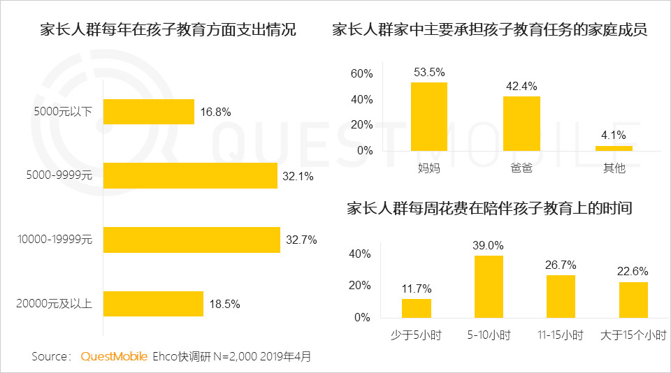 而在家庭人群每年在孩子教育方面支出情況,超八成的家長每年在孩子的教育方面支出均在5000元以上,其中10000-19999元占32.7%,5000-9999元占32.1%。可見人們對于孩子的教育成長真是寄予厚望。而在家長人群中媽媽作為主要承擔孩子教育任務(wù)占53.5%。從中可以看到在孩子的教育問題上,“媽媽”才是教育決策的主要決策者。而在家長人群每周花費在陪伴孩子教育上的時間5-10小時占比最高,達到39%。