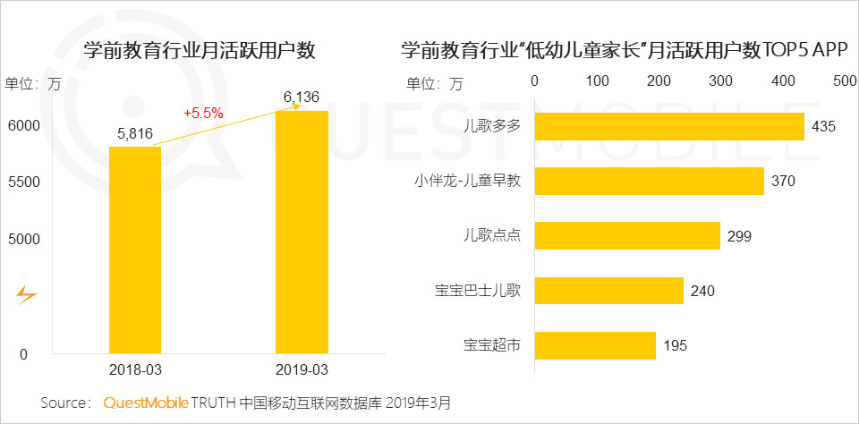 最新數(shù)據(jù)顯示,學前教育用戶增速明顯高于整體移動網(wǎng)民增長速度,而在線早教憑借技術(shù)的快速發(fā)展深得家長喜愛,在學前教育行業(yè)”低幼兒童家長“月活躍用戶數(shù)TOP5APP排列依次分別是兒歌多多、小伴龍-兒童早教、兒歌點點、寶寶巴士兒歌、寶寶超市。其中早教APP兒歌多多以435萬排列第一,其次為小伴龍-兒童早教月活躍用戶達370萬。
