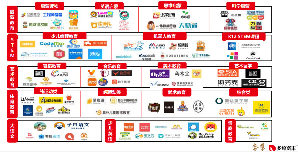 從素質(zhì)教育細分賽道典型公司來看,產(chǎn)品類型覆蓋啟蒙教育、藝術(shù)教育、早幼教平臺、少兒編程教育、情商教育等。