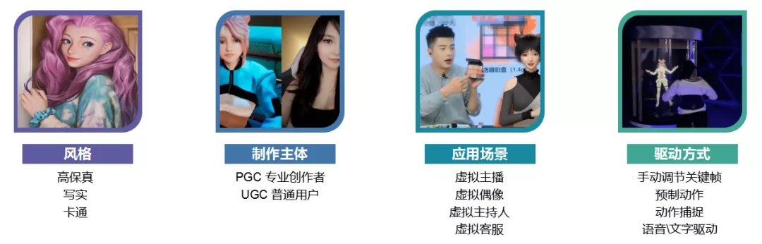 對于虛擬人的技術(shù)分類,我們可以從風(fēng)格、創(chuàng)作主體、應(yīng)用場景、驅(qū)動(dòng)方式幾個(gè)方面進(jìn)行了解: