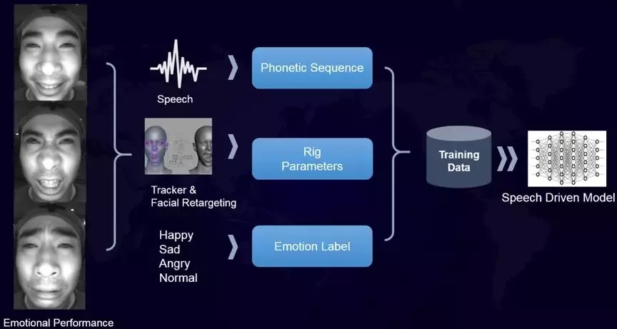 為此,團(tuán)隊(duì)建立了一套精確的面部動(dòng)捕流程,以不同情感下的動(dòng)作捕捉,來訓(xùn)練語音驅(qū)動(dòng)模型,最終構(gòu)造了一個(gè)長約20個(gè)小時(shí)、13339條語句的,包含語音、面部運(yùn)動(dòng)和身體運(yùn)動(dòng)的多模態(tài)訓(xùn)練數(shù)據(jù)集。在Siren AI 基礎(chǔ)上,增加情感維度數(shù)據(jù),讓Matt擁有微笑、蹙眉等微表情,多了更自然的“人情味”。