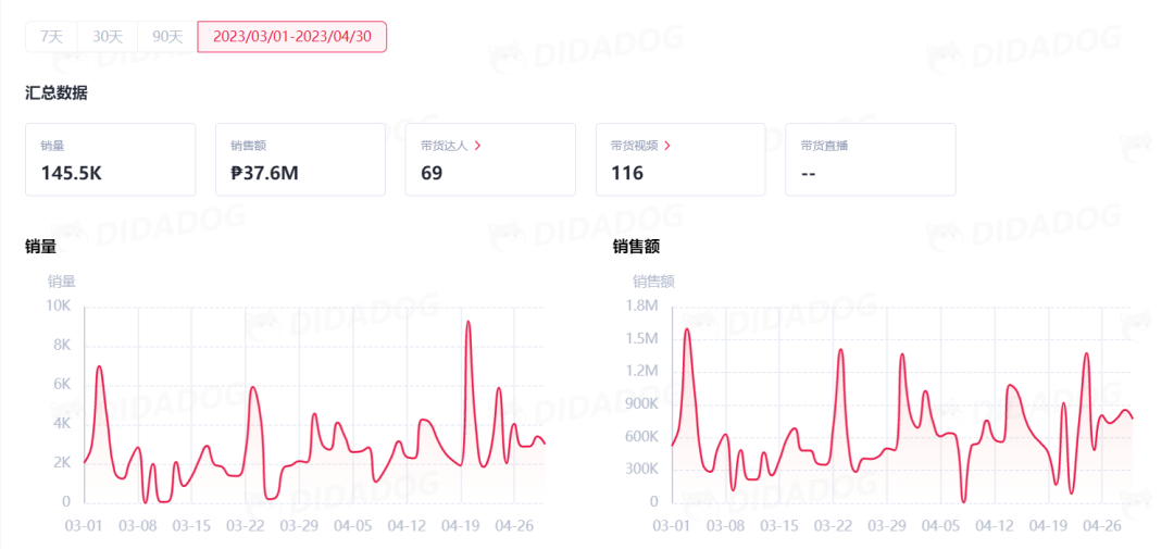 品牌Unilove在3-4月之間銷量為145.5K,銷售額為?37.6M(736.96K美金),其中,在TikTok的帶貨達(dá)人有69位,帶貨視頻有116個(gè)。在4-20單日銷量達(dá)到了9.6K,在3-3單日銷售額達(dá)到?1.6M(31.36K美金)。