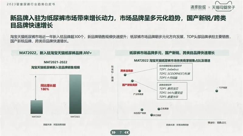 根據(jù)白皮書數(shù)據(jù)統(tǒng)計,近兩年淘系紙尿褲市場新入駐品牌超300個。新品牌銷售規(guī)??焖偬嵘袌銎放瞥识嘣厔?,國產(chǎn)新銳以及跨類目品牌也在快速增長。同時,bebebus、十月結(jié)晶、科巢等品牌先繼進(jìn)入紙尿褲市場,給市場帶來源源不斷的活力。